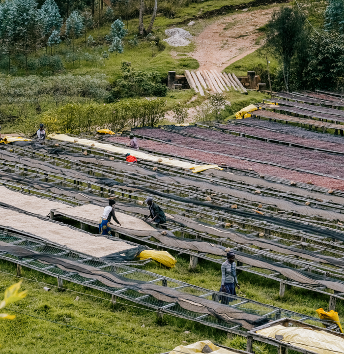 After purchasing cherries from farmers, Karambi’s team begins with flotation to remove lower-quality fruit. The remaining cherries are hand-sorted by skilled staff who inspect each batch for visual defects. Once selected and rinsed, the cherries are laid out on raised beds in thin layers to dry. They are raked frequently to ensure even drying, a process that typically takes about three weeks.