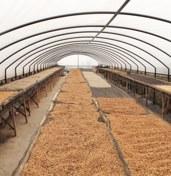 The cooperative handpicks its coffee cherries, which are processed at one of the nine UPH stations overseen by Triyono. The coop follows Sumatra’s unique Wet Hulled method, but has expanded into Honey processing. Cherries are pulped without water and dried in raised beds, protected from the elements. The drying process takes about 20 days, and the coffee is then milled and hand-sorted.